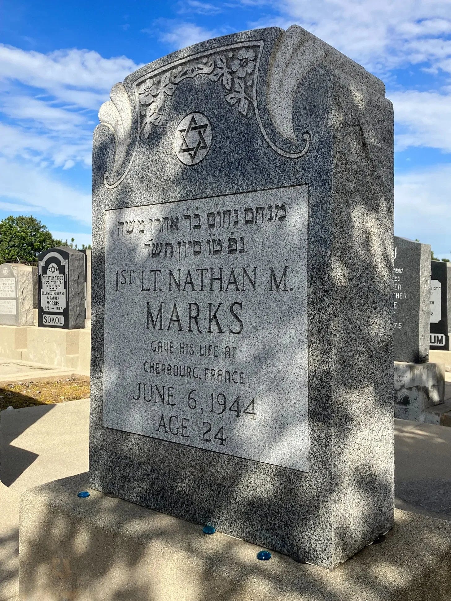 LT Nathan Marks died at the age of 23, leaving behind his family, a wife, and a young son. He was posthumously awarded a Purple Heart Medal. On D-Day, he was initially buried in a little orchard in Pouppeville. Later, on July 7, 1944, he was reinterred in the temporary Military Cemetery of Sainte-Mère-Église, No 2, Normandy, at Plot C, Row 9, 171. In the Fall of 1948, he was reburied at the Beth Israel Cemetery in Los Angeles. May he rest in peace.
