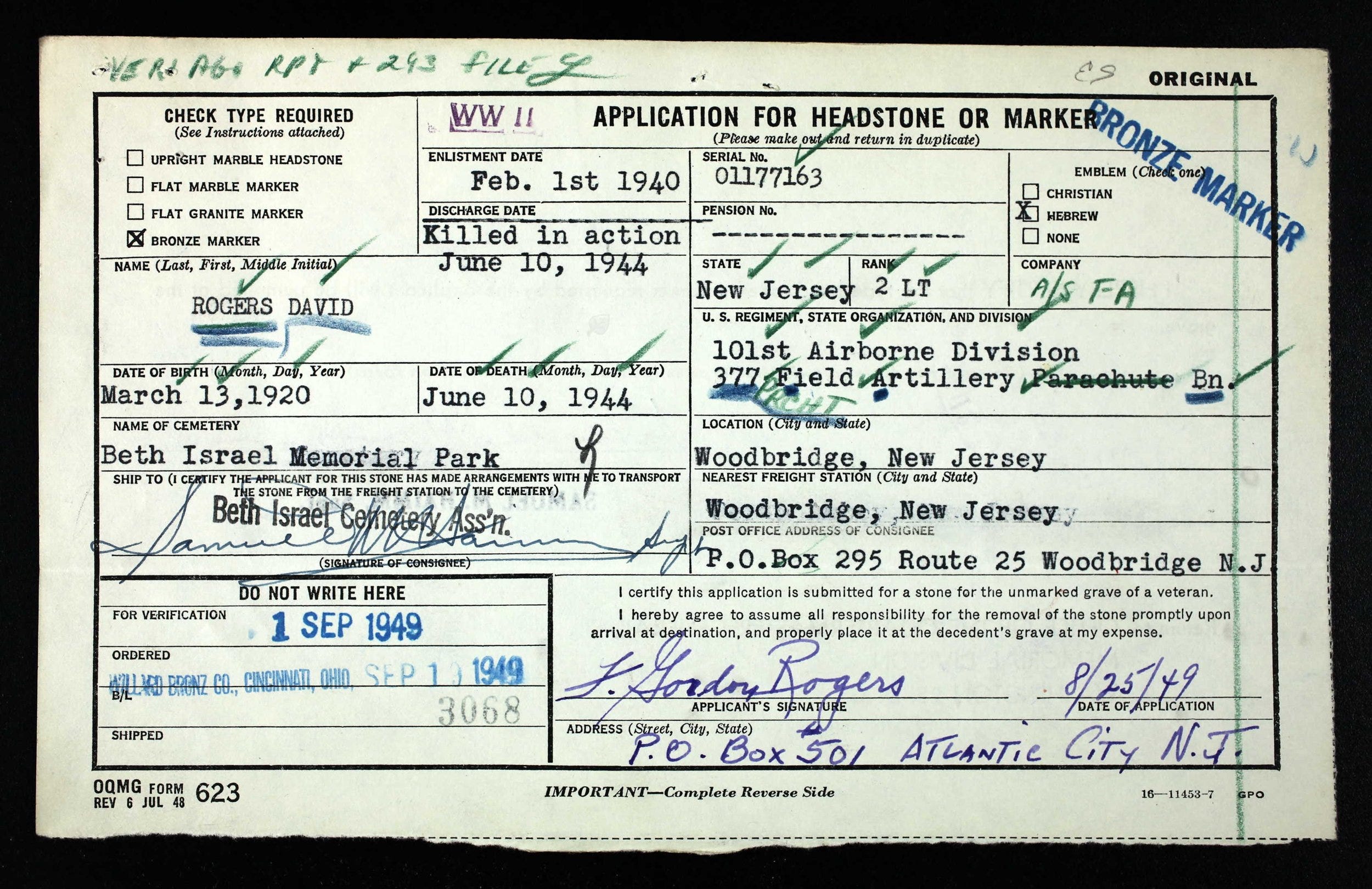Second Lieutenant (2LT) David Rogers of HQ HQ & Service Battery, 377th Parachute Field Artillery Battalion (PFAB), 101st Airborne Division, was born in Newark, Essex County, New Jersey, to F. Gordon and Reba Rogers on March 13, 1920. David was their firstborn. He had two brothers, Harold and Stanley Rogers, and one sister, Phyllis Rogers. Harold and Stanley also served during WWII.