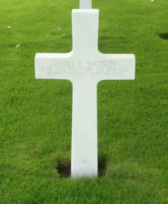 Lieutenant James Watson died at the age of 22. He was posthumously awarded a Purple Heart Medal. After his initial internment in the temporary military cemetery of Son, the Netherlands, at Plot A, Row 8, Grave 152, he was later reburied in the American War Cemetery Margraten, the Netherlands. Since the spring of 1949, Lieutenant Watson has rested eternally at Plot J, Row 10, Grave 22 in Margraten. May he rest in peace.