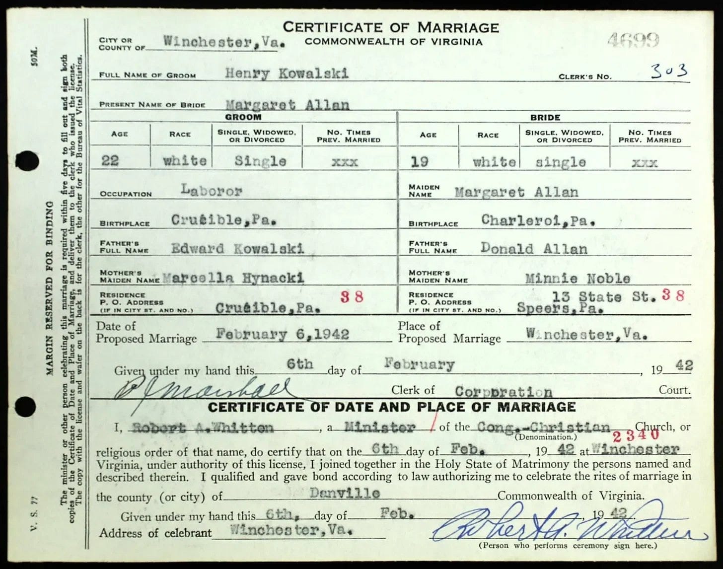 He graduated from Cumberland Township High School with the class of 1937 after which he was employed by the Crucible Fuel Company. On February 6, 1942, he married Margaret Allen at Winchester, Virginia.