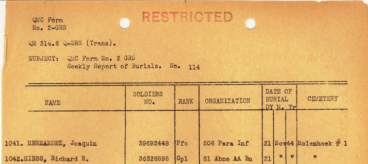 He was buried at the temporary military facility Molenhoek #1 on November 21, 1944. His body was returned home under the “Return of the Dead Program”, where he was reburied at the Secor Cemetery in Secor, Woodford County, Illinois, on Friday, January 28, 1949. CPL Hibbs was posthumously awarded a Purple Heart Medal.