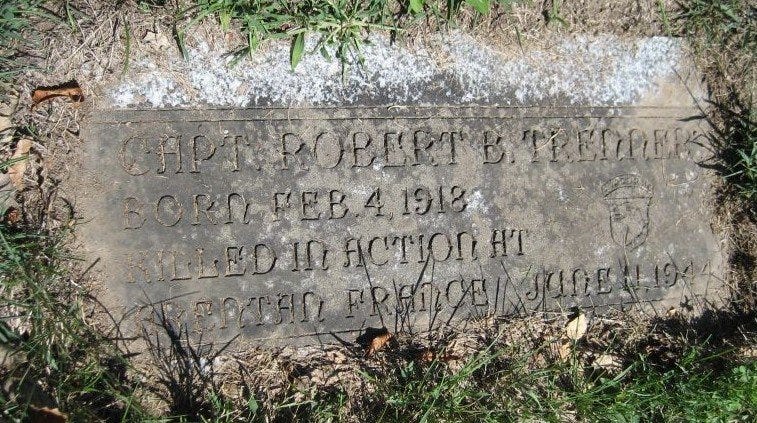 CPT Robert Trenner died at the age of 26 in Normandy, France. He was posthumously awarded a Purple Heart Medal. On June 14, 1944, he was first buried at the Temporary American Military Cemetery of Sainte-Mère-Eglise #1 at Plot B, Row 10, Grave 197. He was disinterred on March 19, 1948, and moved by truck to Cherbourg, where his casket was placed on the USAT Lawrence Victory on April 26, 1948. After he arrived in New York Harbor on May 7, 1948, he was transported by train to Fort Wayne, where he arrived on 7 June. CPT Trenner rests eternally at the Lindenwood Cemetery, Wayne Township, Allen County, Indiana.