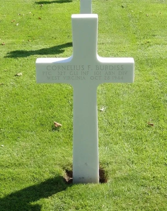 We honor and remember PFC Cornelius Francis Burdiss of Regimental Headquarters Company, 327th GIR, 101st Airborne Division.