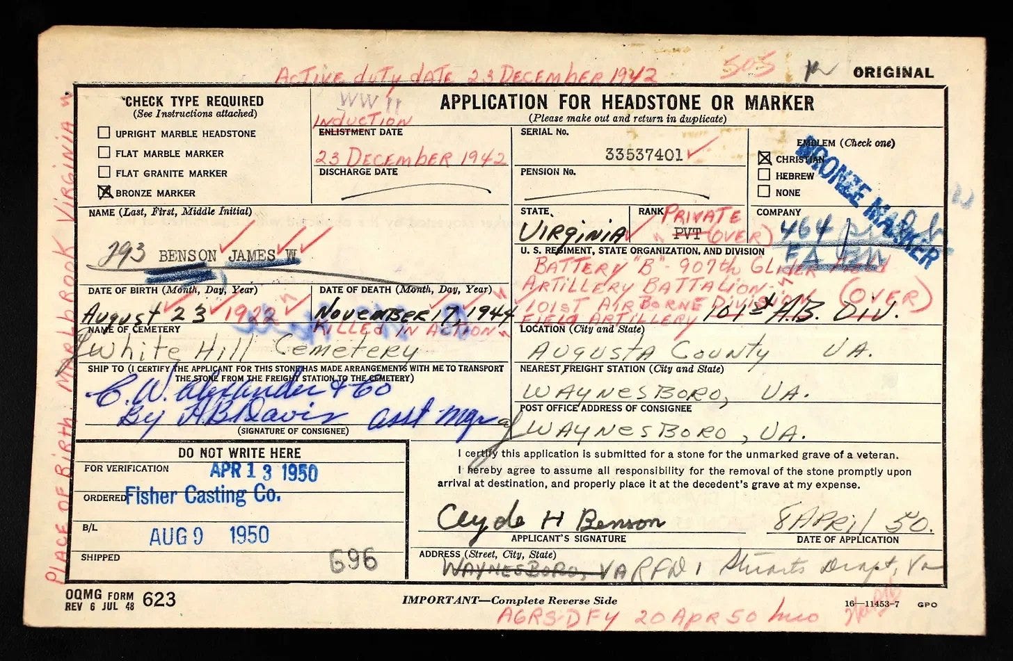 Private First Class (PFC) James William Benson of the Headquarters and Headquarters Service Battery, 907th Glider Field Artillery Battalion (GFAB), 101st Airborne Division, was born in Marlbrook, Rockbridge County, Virginia, to Clyde H. and Willie C. (Drawbond) Benson on August 23, 1922. James had four brothers, Wallace C., Robert E., Theron T., and George P. Benson, and three sisters, Mary E. (Benson) Henderson, Ruth D. (Benson) DePriest, Mabel C. (Benson) Coffey, and Carleen (Benson) Desper.