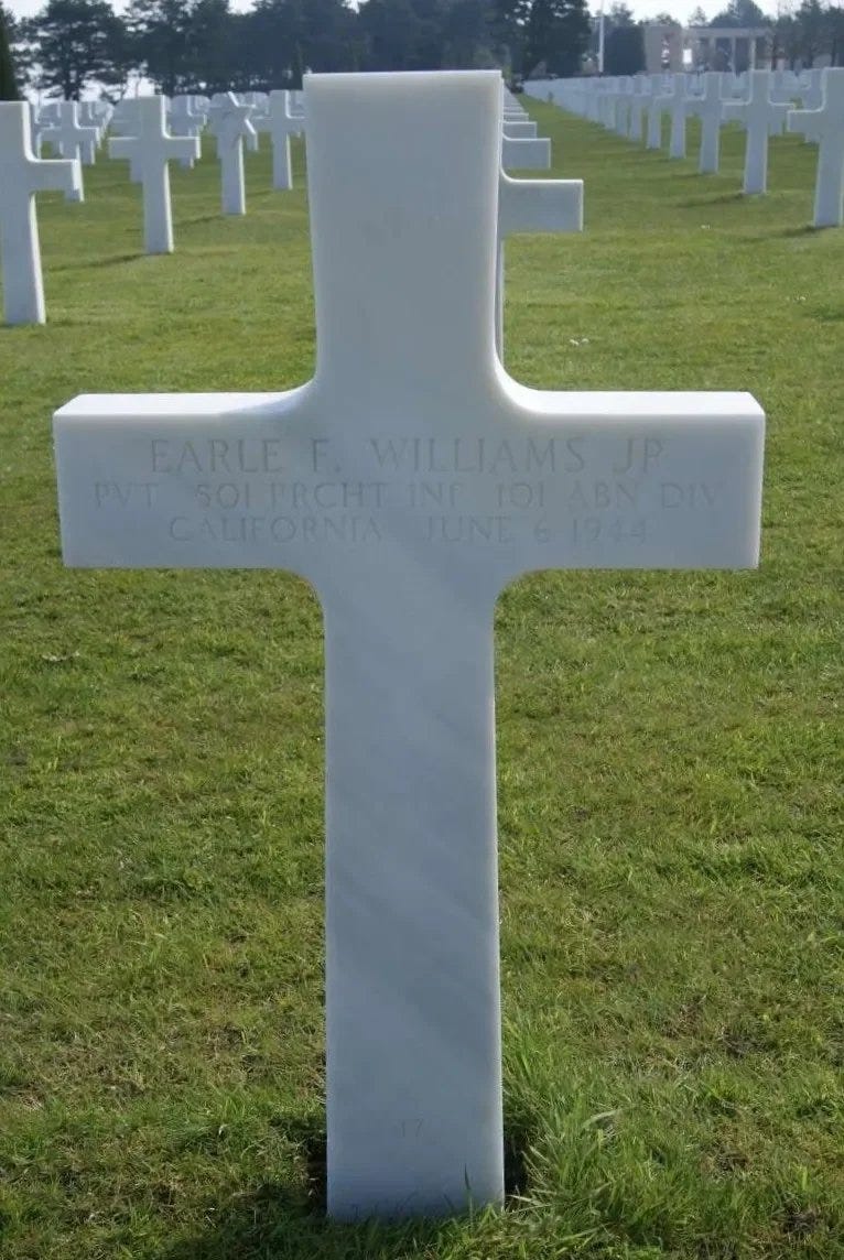 On D-Day, June 6, 1944, PVT Earle F. Williams Jr. flew in a C-47 across the Channel toward Normandy. His plane was shot down by German anti-aircraft fire and crashed near Picauville, Normandy, at 0120 hours. The crew and all paratroopers of the stick were killed in action.