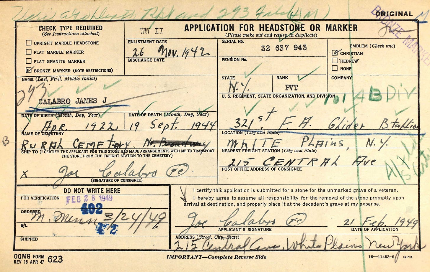 Private (PVT) James Joseph Calabro of Baker Battery, 321st Glider Field Artillery Battalion (GFAB), was born in Villa San Giovanni, Reggio di Calabria, Italy, to Giuseppe and Giovanna Calabro on April 1, 1922. James had one brother, Frank Calabro, and two sisters, Antoinette and Lucreza Grace Calabro. His brother Frank served as a corporal with the U.S. Army Air Corps during WWII.