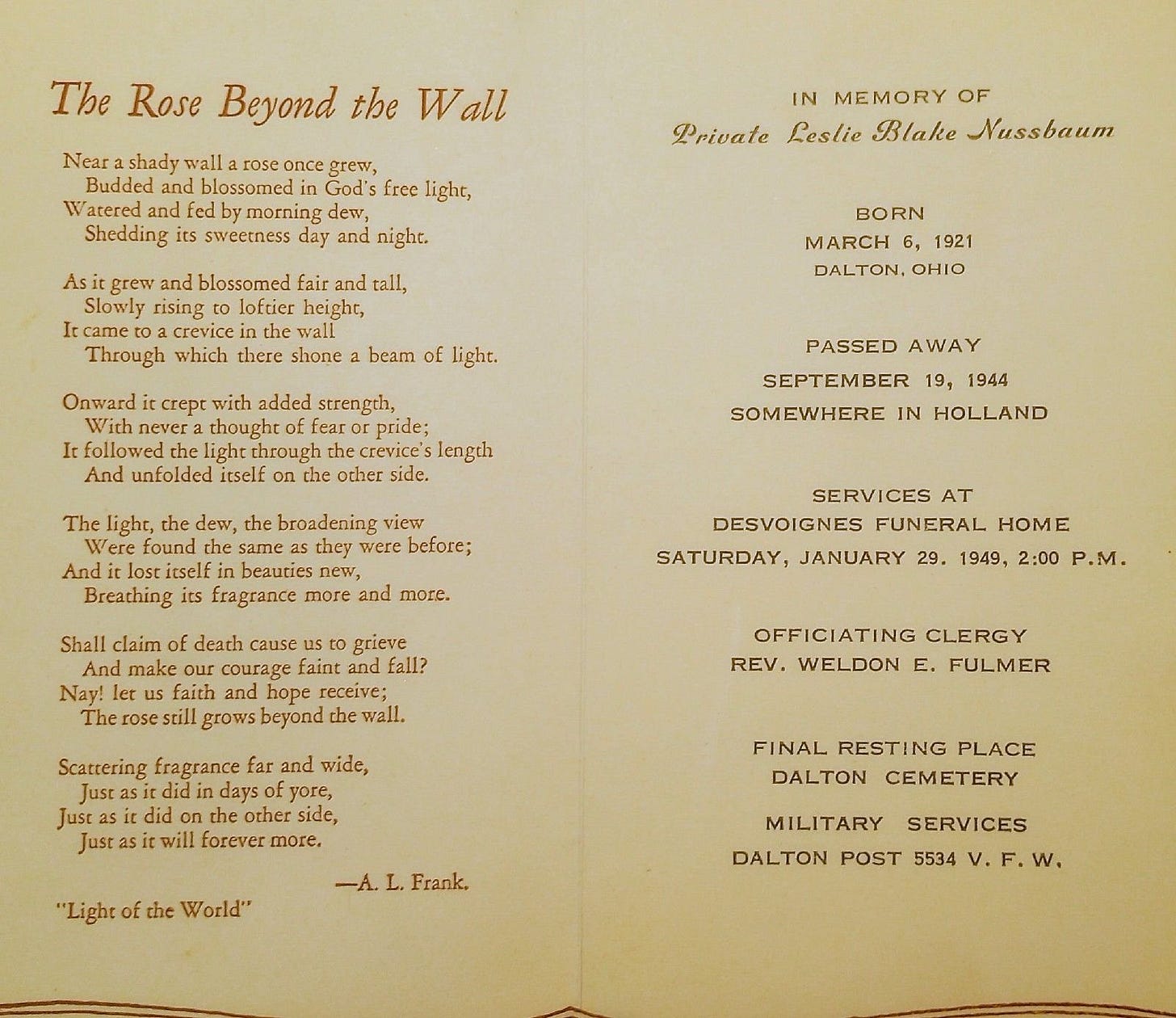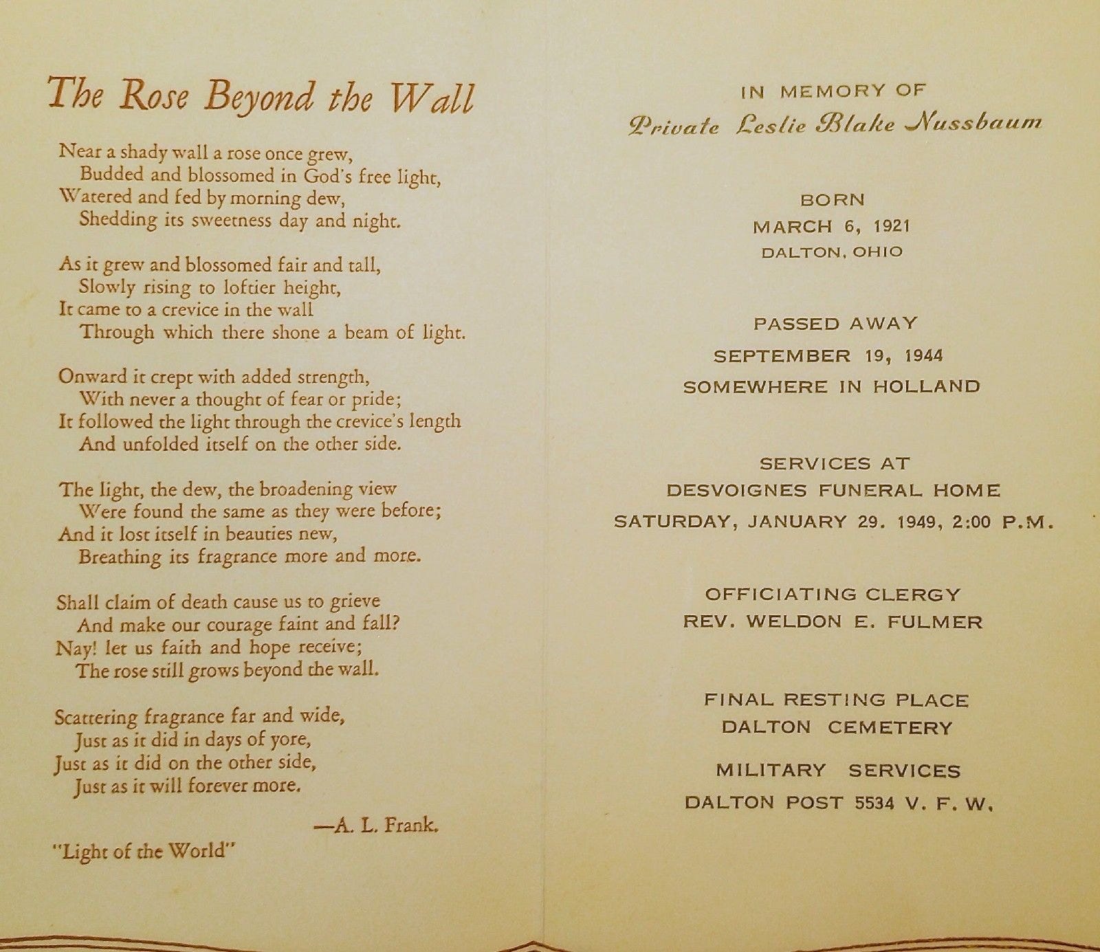 Leslie was first buried at the Temporary American Military Cemetery of Son, the Netherlands, at plot A, Row 3, Grave 50. He was disinterred on June 14, 1948, and moved by rail from the American Cemetery at Margraten, the Netherlands, to the port of Antwerp, Belgium, where his casket was placed on the USAT Barney Kirschbaum on December 7, 1948. After arriving in New York Harbor, he was transported by train to Orrville, Ohio, on Wednesday, January 26, 1949. He was reburied three days after returning home. PVT Leslie Nussbaum rests eternally at the Dalton Cemetery of Wayne County, Ohio.