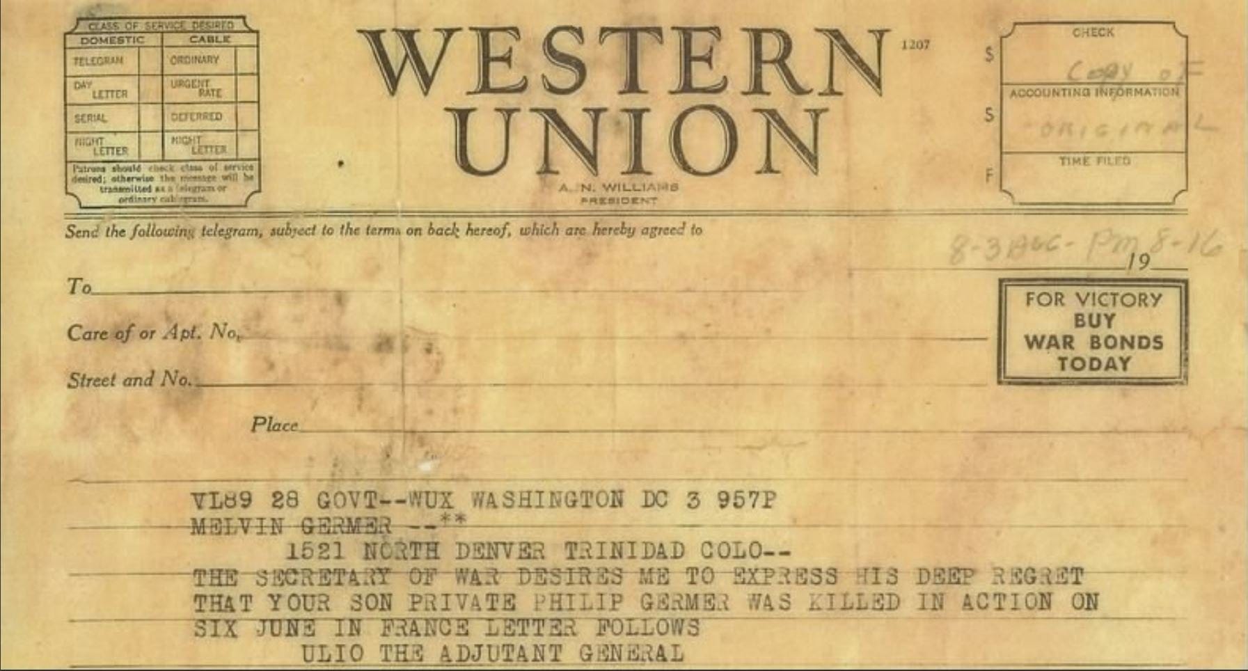 PVT Philip Germer died at the age of 20. He was first buried in the temporary military cemetery of Hiesville, Normandy, on June 10, 1944, after which he was moved to the nearby temporary military cemetery of Blosville on July 4, where he was laid to rest at Block I, Row 10, Grave 181. In 1949, he was re-interred at the Normandy American Cemetery and Memorial, at plot C, Row 28, Grave 30. May he rest in peace.