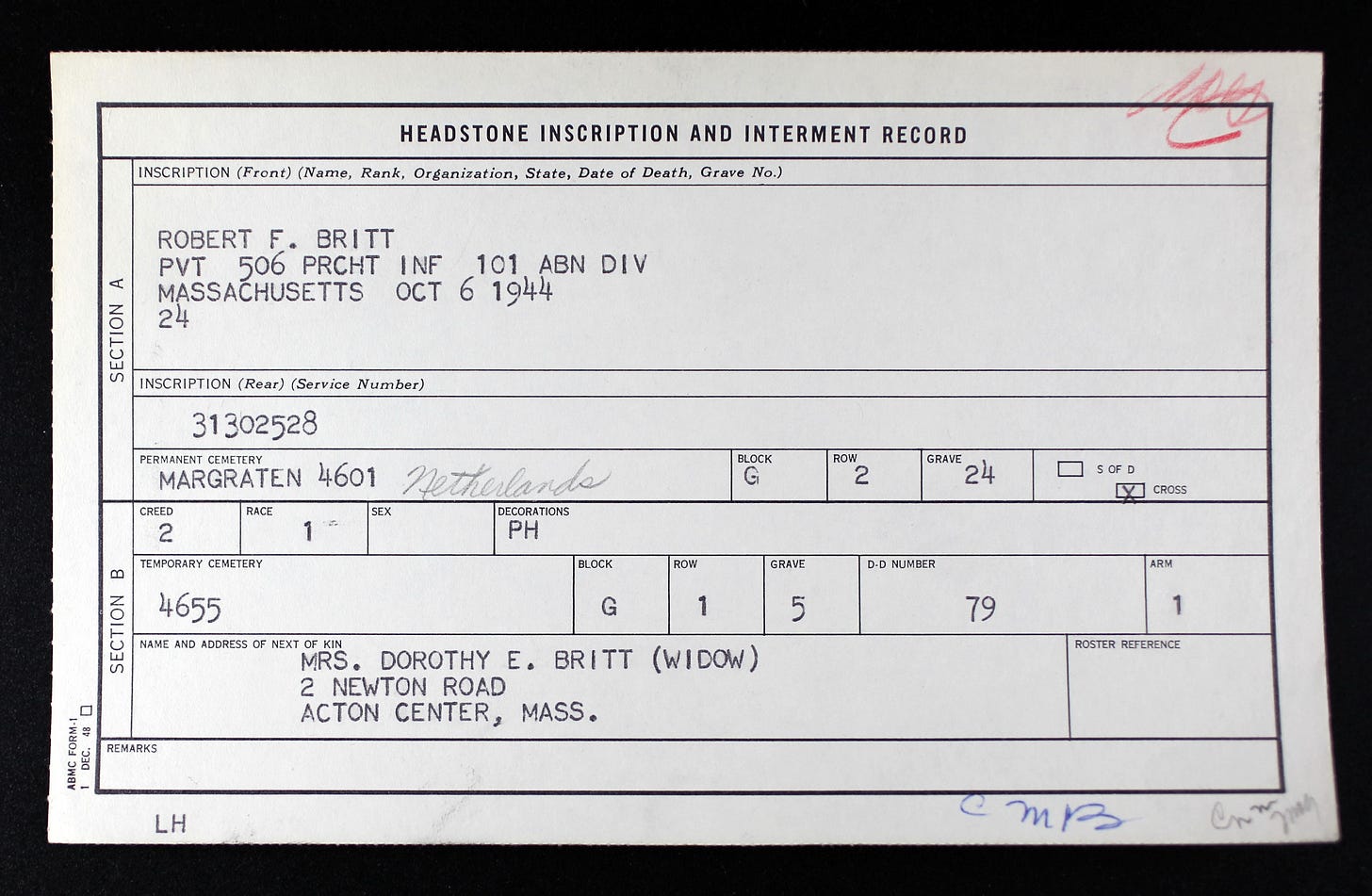 PVT Robert Britt died at the age of 22 on October 6, 1944. The Weekly Report of Burials (No. 109), made up by the Quartermaster Company of the Grave Registration, lists Robert with the 426th Airborne Quartermaster Company when he was buried at Block G, Row 1, grave 5 of the temporary American Military Cemetery at Molenhoek, on October 6, 1944. None of the available morning reports of the time that he served with the 506th Service Company indicates, though, that Robert was transferred to the 426th Airborne Quartermaster Company.