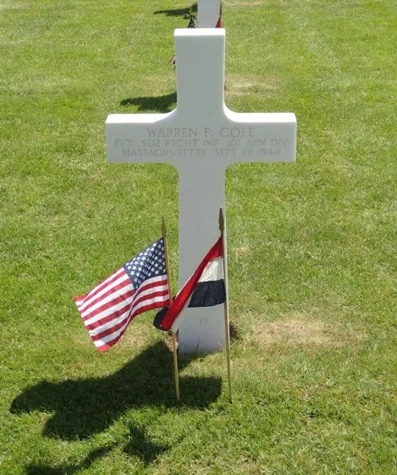 PVT Warren Cole died at the age of 24 on September 28, 1944. He was posthumously awarded a Purple Heart Medal. After his initial burial in a temporary military cemetery in the Netherlands, he was reburied at the Netherlands American Cemetery and Memorial, Margraten, at Plot A, Row 4, Grave 19. May he rest in peace.