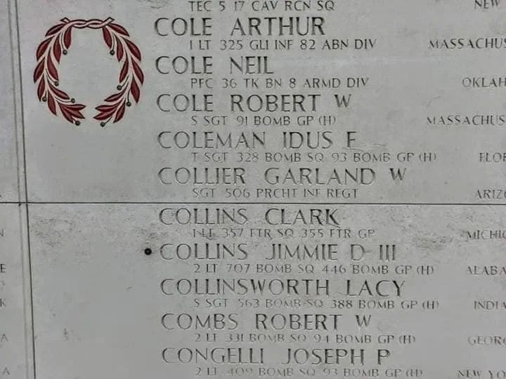 Collier’s name is recorded on the Walls of the Missing at the Netherlands American Cemetery, an American Battle Monuments Commission site in Margarten, Netherlands, along with others still missing from WWII. A rosette will be placed next to his name to indicate he has been accounted for.