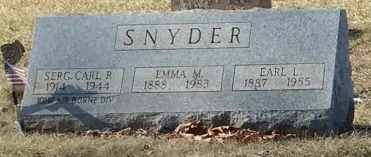 Sergeant (SGT) Carl R. Snyder of Baker Company, 1st Battalion, 327th Glider Infantry Regiment (GIR), was born in Barberton, Summit County, Ohio, to Earl L. and Emma M. (Pitz) Snyder on March 3, 1914. He was their youngest child. Carl had two brothers, Russell L. and Donald T., and two sisters, Ida M. and Bernice L. Snyder.